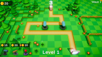 3 types of towers: blue one is bullet type, yellow one is missile type and red one is a slow down effect.